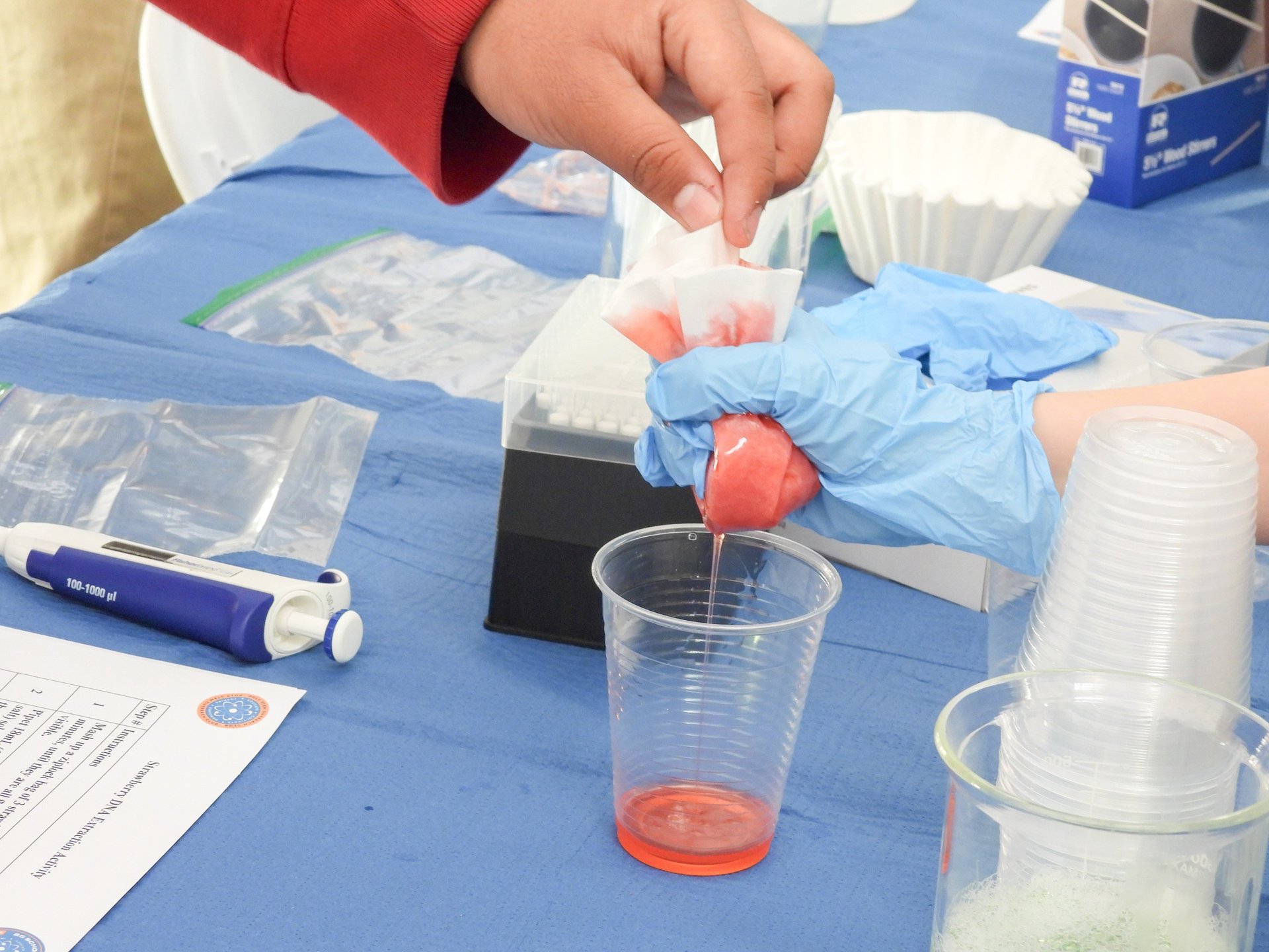 We're doing this experiment to see DNA with our own eyes. By smashing the strawberry and using simple ingredients, we can pull the DNA out of the cells and watch it appear as white, stringy stuff. It's a fun way to learn about how life works at the tiniest level!